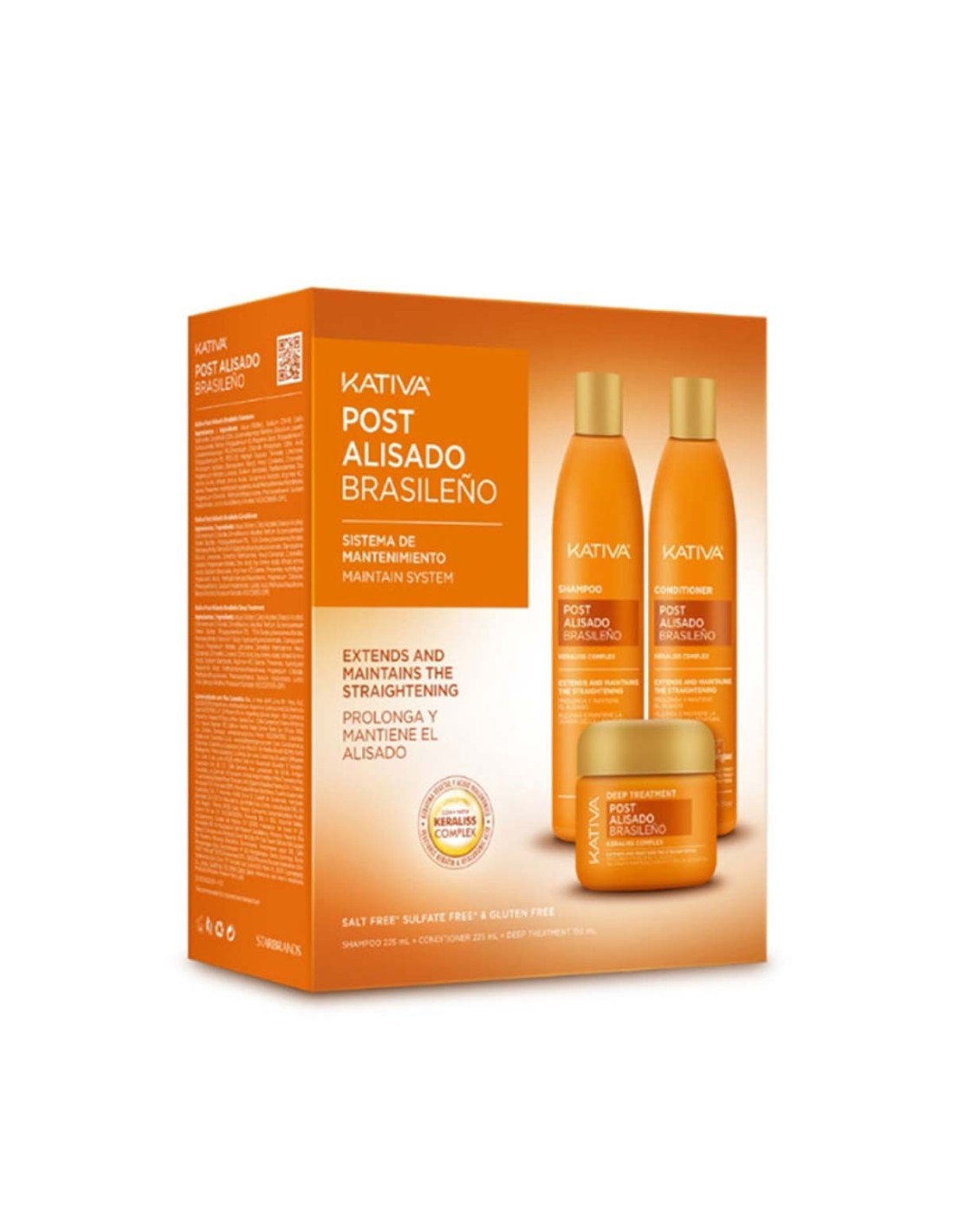 KativaKativa Kit Post Alisado Brasileño Shampoo, Conditioner and Intensive Repair Treatment is a promotional pack consisting of a shampoo, a conditioner and an intensive repair treatment to prolong and preserve straightening. Formulated with Keraliss Complex, an exclusive complex with vegetable keratin and hyaluronic acid to control the effects of environmental humidity. Free from salt, sulphates and gluten.
